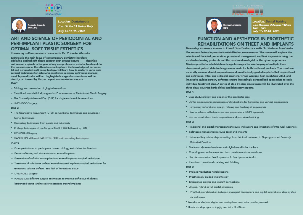 The success factors in prosthetic rehabilitation are numerous. The course will explore the selection of the ideal preparation, provisional management and final impression using the established analog protocols and the most modern digital or the hybrid approaches.Modern prosthetic rehabilitation design leverages the overlapping of multiple three-dimensional patient data to design a new smile for both teeth and implants. This results in minimally invasive dental preparations and prosthetically guided implants that respect hard and soft tissue. Intra- and extraoral scanners, virtual wax-ups, high-resolution CBCT, and innovative guided surgery software ensure increasingly personalized approaches to each individual treatment plan.A series of step-bystep clinical cases will be illustrated over the three days, covering both clinical and laboratory aspects.