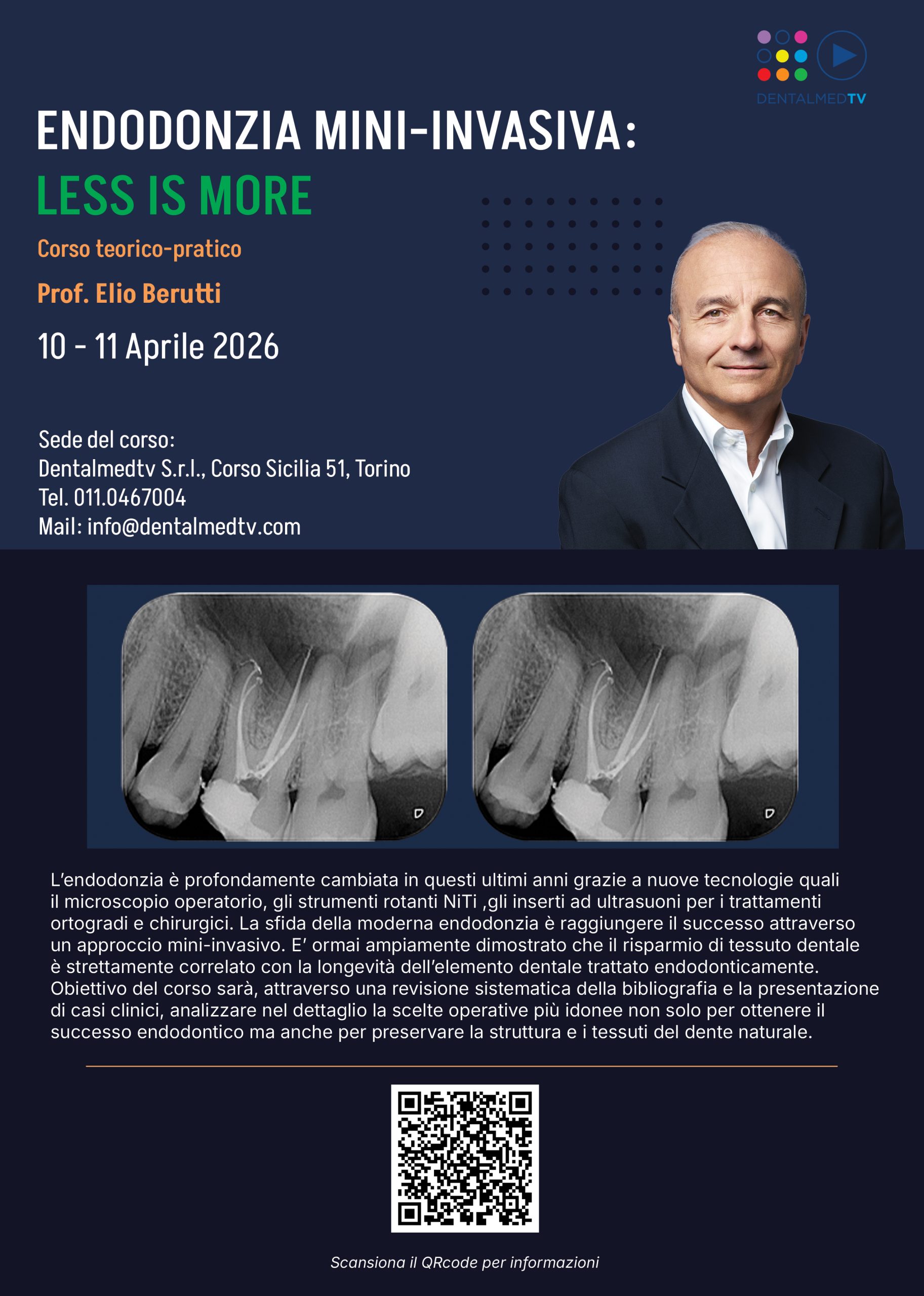 L’endodonzia è profondamente cambiata in questi ultimi anni grazie a nuove tecnologie qual iil microscopio operatorio, gli strumenti rotanti NiTi gli inserti ad ultrasuoni per i trattamenti ortogradi e chirurgici. La sfida della moderna endodonzia è raggiungere il successo attraverso un approccio mini-invasivo. E’ ormai ampiamente dimostrato che il risparmio di tessuto dentale è strettamente correlato con la longevità dell’elemento dentale trattato endodonticamente. Obiettivo del corso sarà, attraverso una revisione sistematica della bibliografia e la presentazione di casi clinici, analizzare nel dettaglio la scelte operative più idonee non solo per ottenere il successo endodontico ma anche per preservare la struttura e i tessuti del dente naturale.